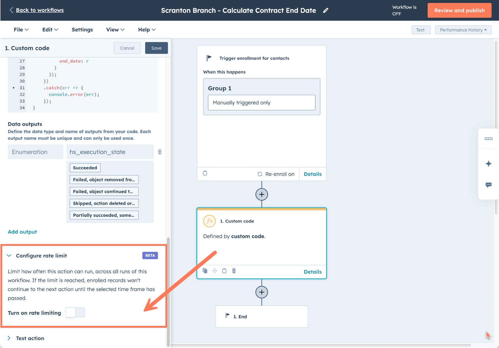 HubSpot's new rate limiting feature for custom code and webhook actions solves this elegantly. In the action settings, you'll find a "Configure rate limit" toggle. Enable it to control how often the action can run across all workflow executions. By throttling the action to process one conversation every ten seconds, you ensure each ticket is routed and the agent assignment is recorded before the next conversation is processed. The workflow action logs show exactly when an action has executed successfully and when it's been paused due to rate limiting, including when it will retry — useful for troubleshooting during rollout. It's a small configuration change that transforms unreliable parallel execution into predictable sequential routing.
